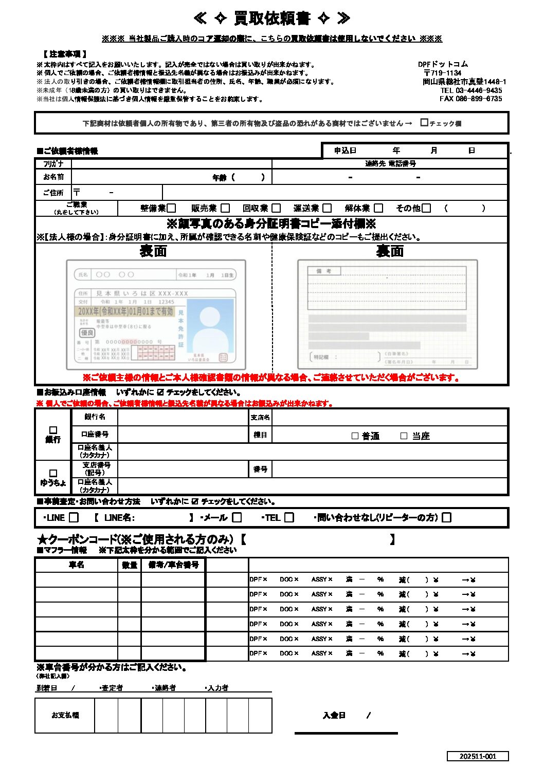 買取には、「買取依頼書」と「身分証のコピー」が必要となります。